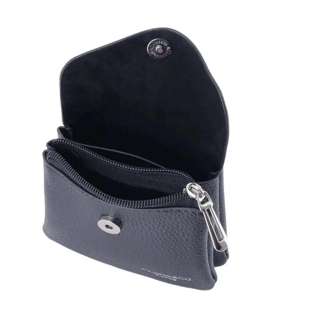 - Interior: One zipped pocket for coins and one pocket for miscellaneous items. A flat compartment is located between the two pockets.