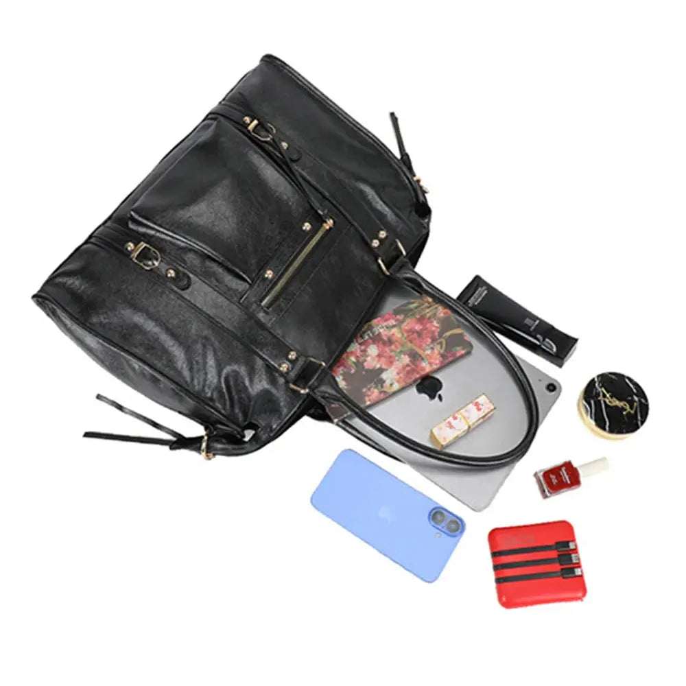 Made from soft and durable synthetic leatherette , it can be easily carried by hand or over the shoulder thanks to its rigid handles and adjustable shoulder strap (66 to 120 cm) . Its large size (39 x 30 x 15 cm) allows you to store files, tablet, wallet and other essentials with ease.