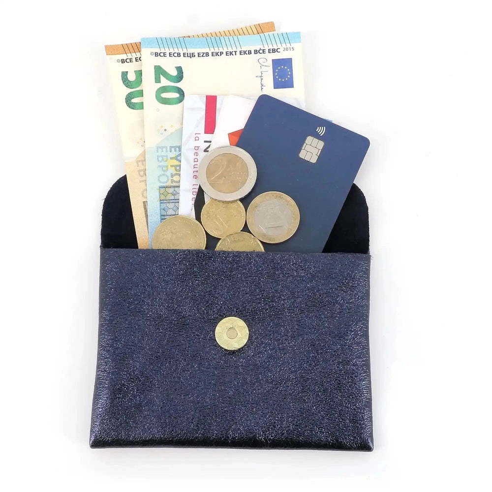 Genuine leather "Made in Italy" coin purse, iridescent look and suede lining. Ultra-light, with 1 practical compartment and magnetic closure. Elegant and functional.