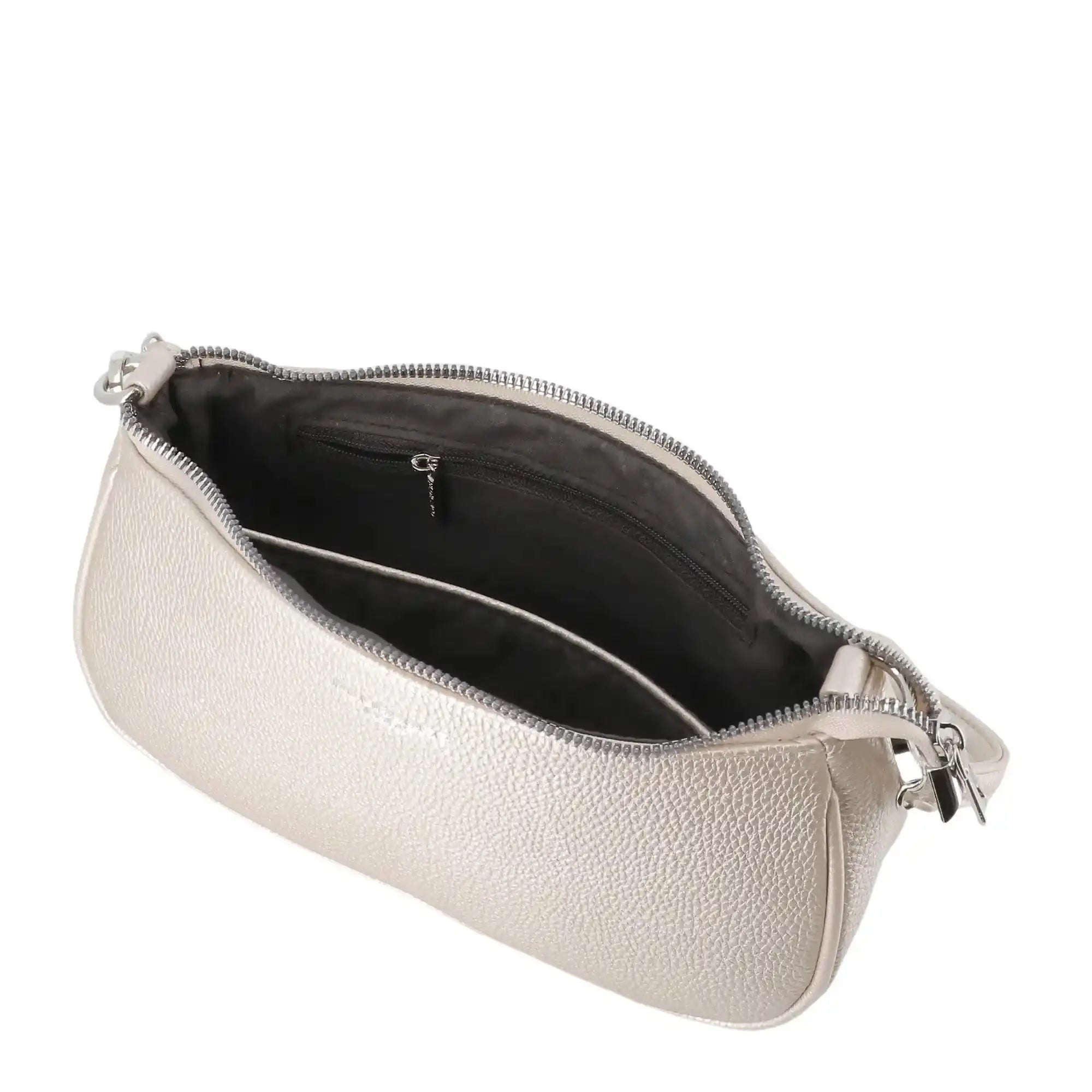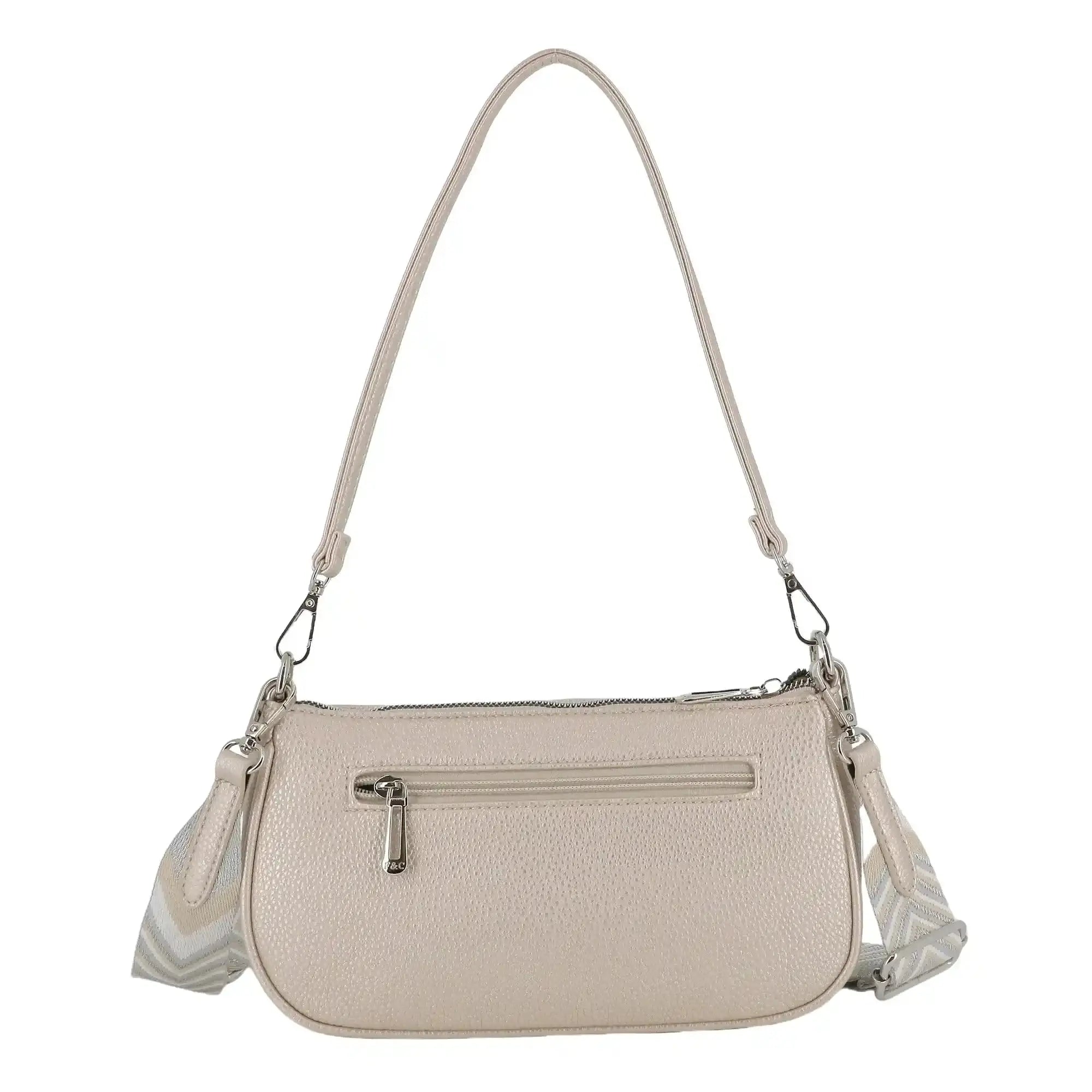 This textured PU leather shoulder bag combines elegance and practicality with its compact baguette design (25 x 13.5 x 6.5 cm). It includes two interchangeable shoulder straps: one in PU leather and one in printed fabric. Its spacious interior with a zippered pocket keeps your essentials organized. The zipper closure ensures security, while the silver metallic details and discreet logo add a refined touch, ideal for everyday use or special occasions.