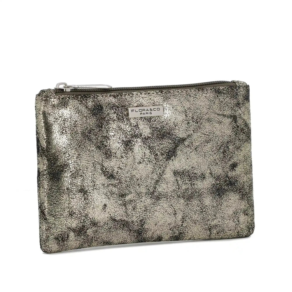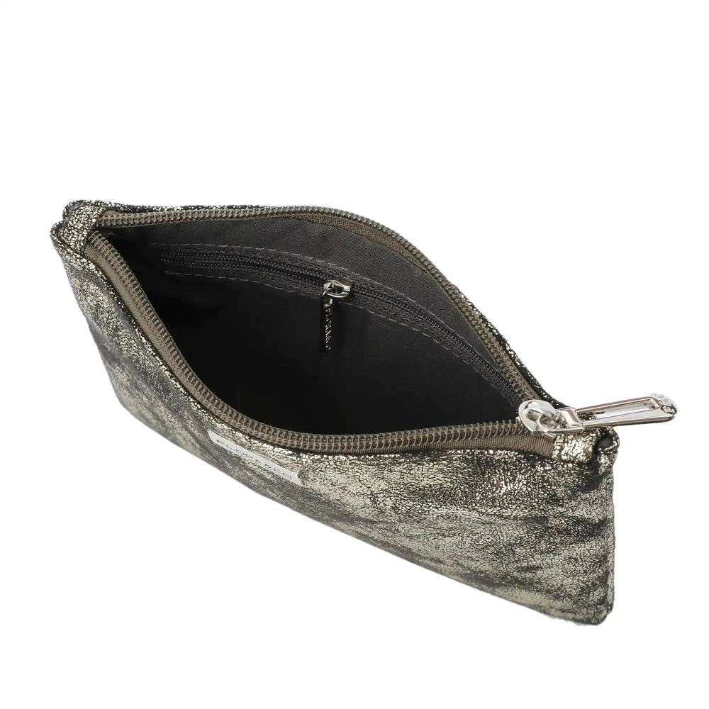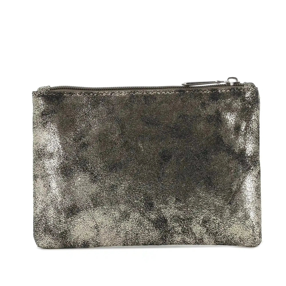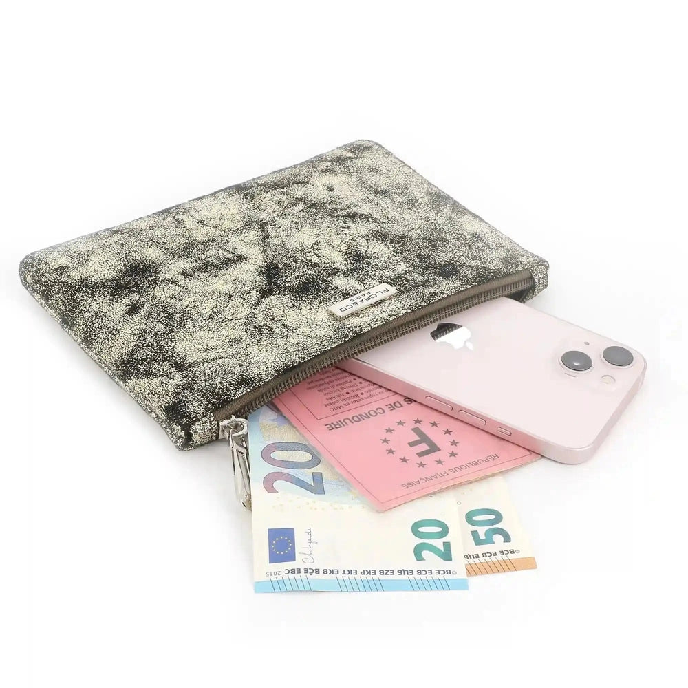 Pochette élégante en similicuir brillant et daim, avec fermeture éclair et pochette zippée intérieure. Pratique pour billets, cartes bancaires, et petits objets divers.