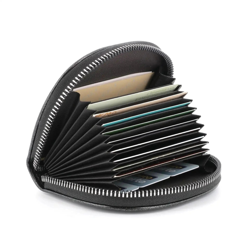 Porte-cartes accordéon compact et élégant, avec 11 emplacements spacieux pour cartes, billets et reçus. Fabriqué en similicuir grainé, doublé polyester, il se ferme par un zip argenté sécurisé.