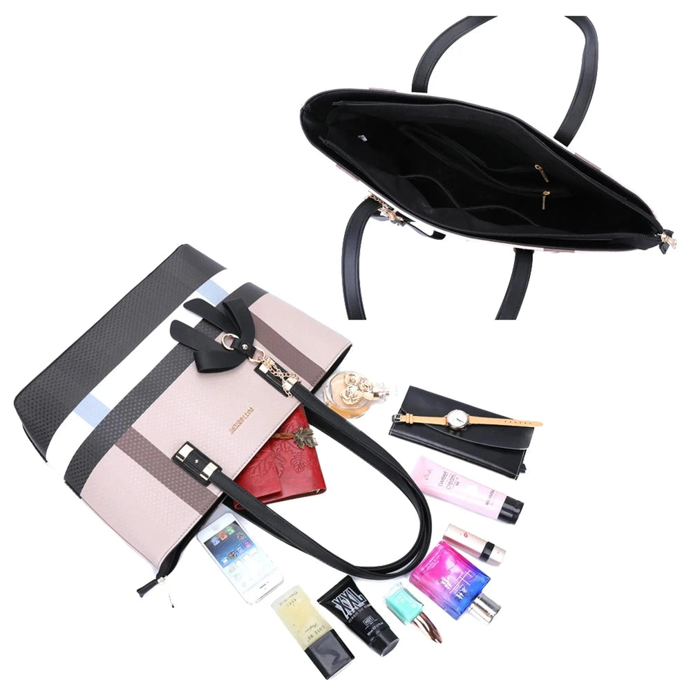Craquez pour ce sac à main fourre-tout avec 2 anses souples et des boucles métalliques dorées ornées d’un nœud papillon. Fabriqué en matière synthétique semi-rigide, il se ferme par un zip pour plus de sécurité. Dimensions : 45x30x13 cm, hauteur de poignée : 28 cm.