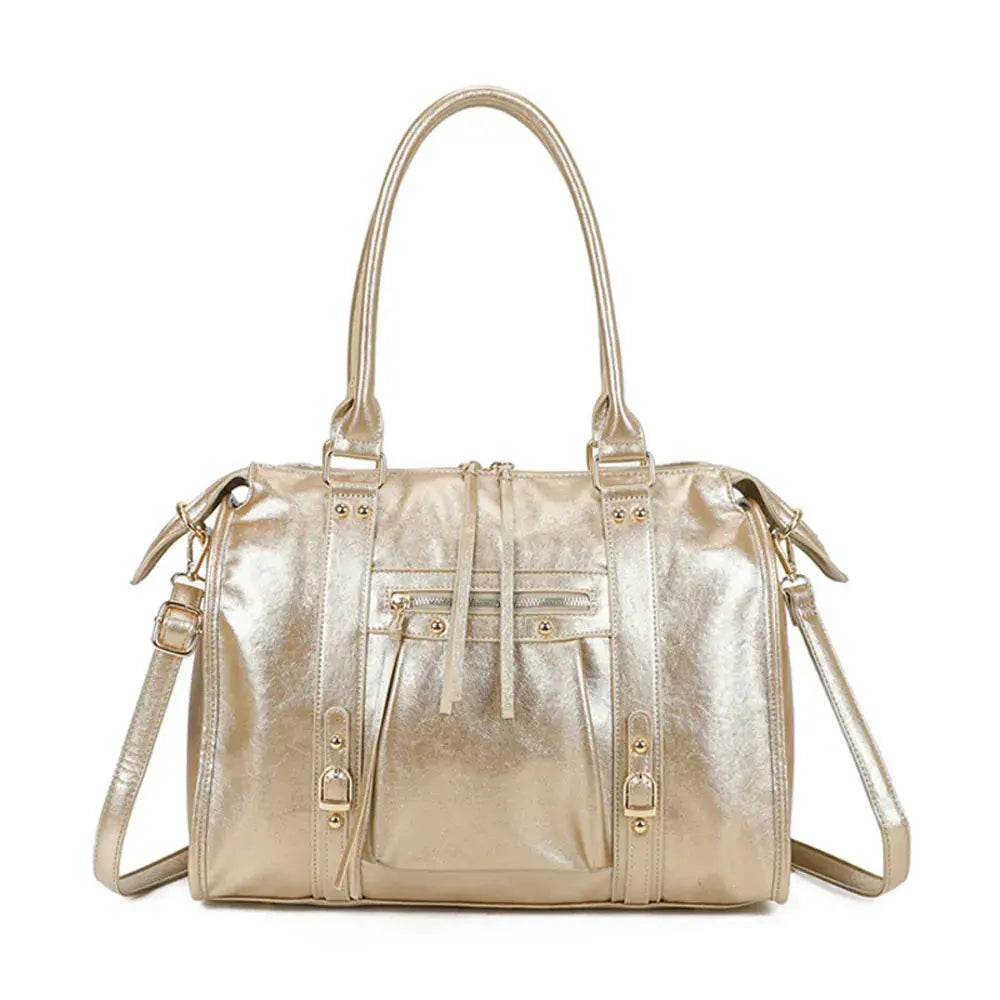Craquez pour ce sac à main bowling irisé au design structuré et résolument urbain. Son fini légèrement brillant et ses lignes modernes en font un accessoire tendance, parfait pour sublimer vos tenues du quotidien. Orné de lanières décoratives, de rivets discrets et d’une poche zippée à l’avant, ce sac combine élégance et praticité.